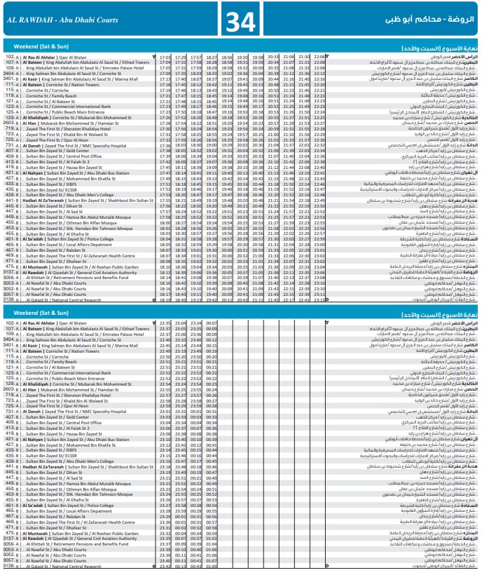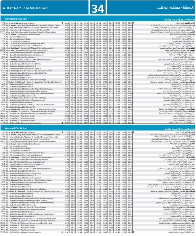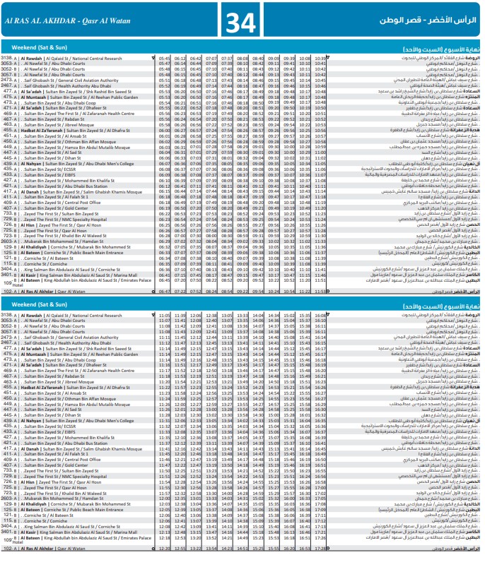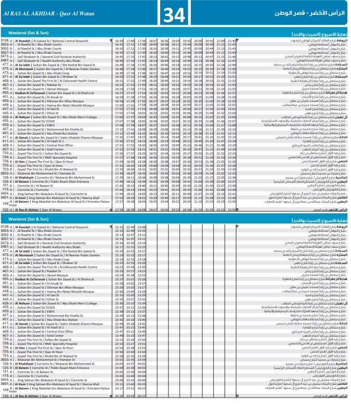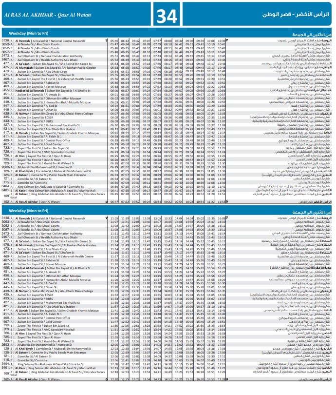 Abu Dhabi DOT Bus no: City Bus 34-Runs between Al Rawdhah, Al Nawfal St / Abu Dhabi Courts and Al Ras Al Akhdar, Qasr Al Watan
