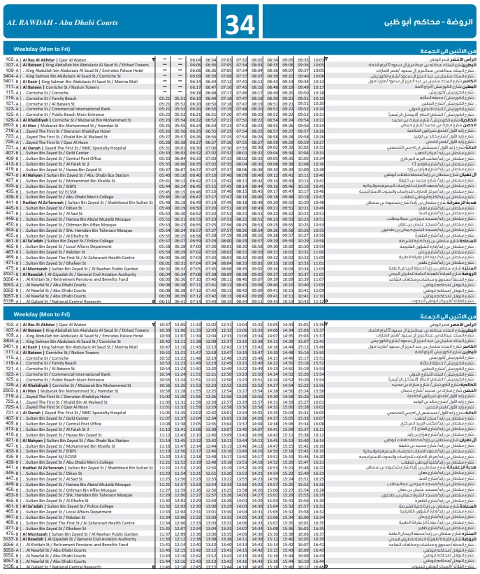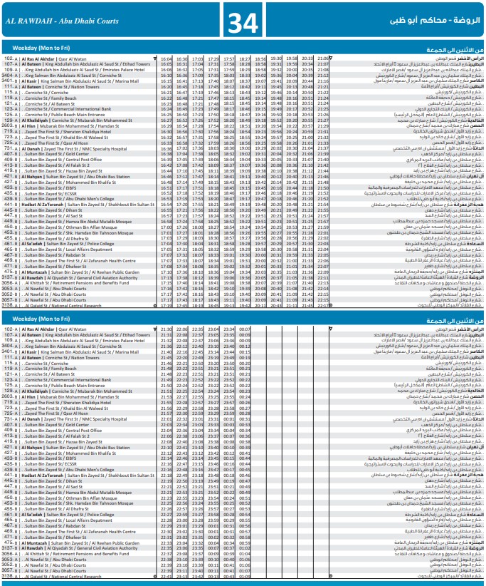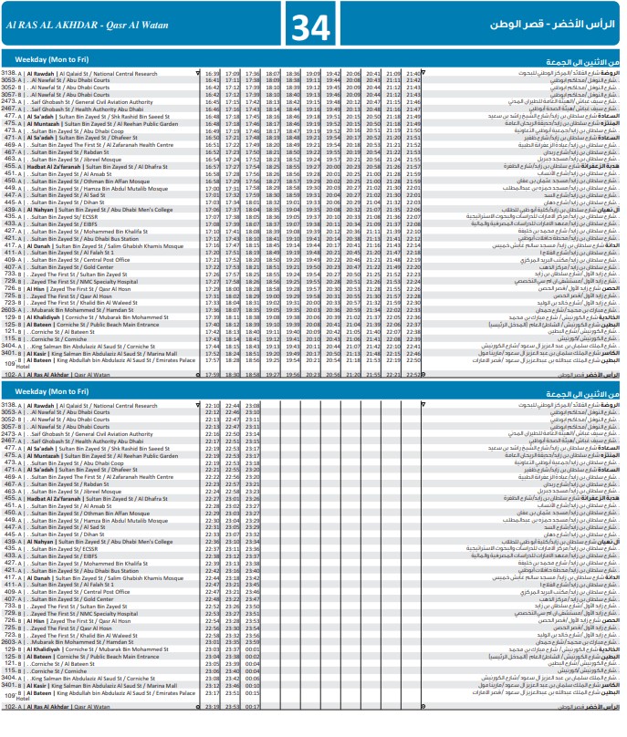 Abu Dhabi DOT Bus no: City Bus 34-Runs between Al Rawdhah, Al Nawfal St / Abu Dhabi Courts and Al Ras Al Akhdar, Qasr Al Watan
