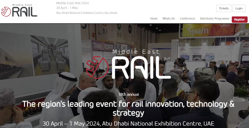 Middle East Rail will take place on 30 April–1 May 2024 in Abu Dhabi, UAE. As a regional rail show for innovation, technology and strategy in the sector, the event expects to welcome around 6,000 attendees, 400 speakers, 300 exhibitors and 600 VIPs from across the industry.