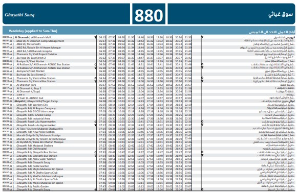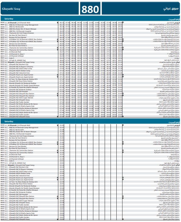 Abu Dhabi Bus number Reg Bus 880 stops at the below bus stops: